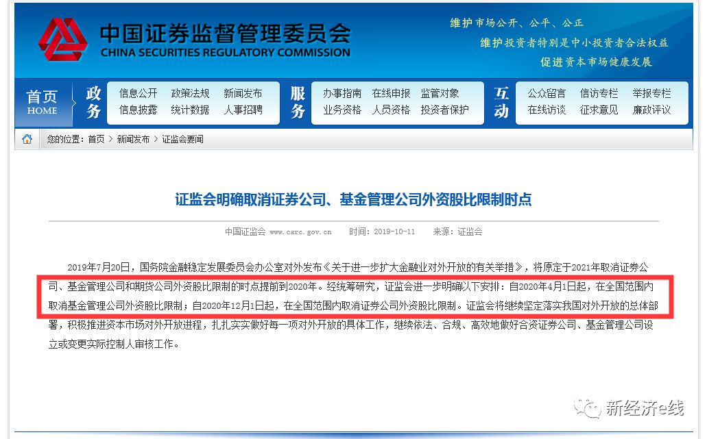 10月11日,证监会新闻发言人高莉宣布,证监会明确取消证券公司、基金管理公司外资股比限制时点。其中,自2020年4月1日起,在全国范围内取消基金管理公司外资股比限制。