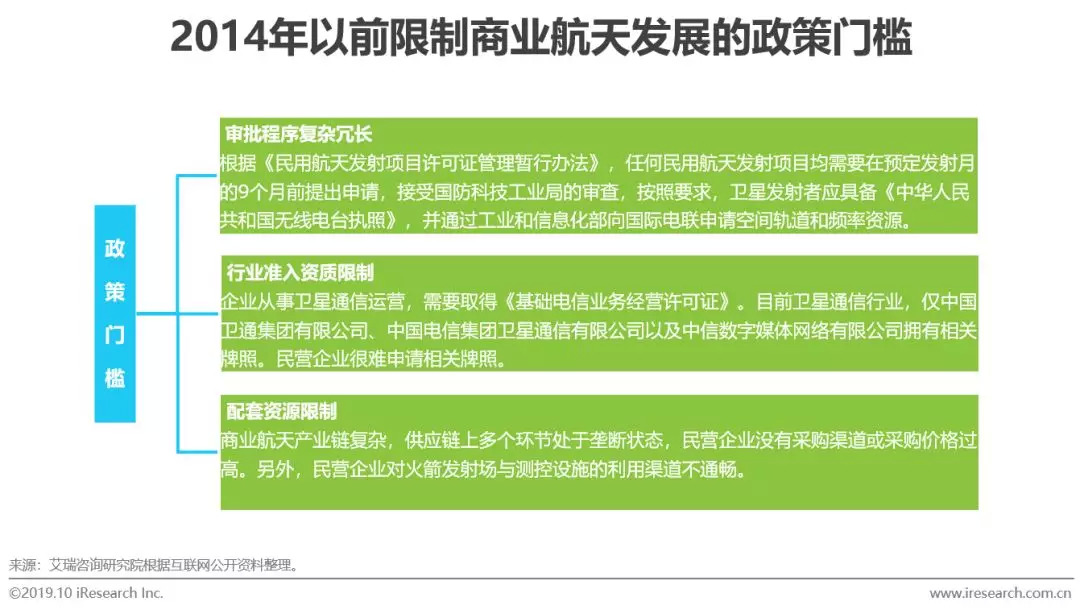 航天产业受政策因素影响极大,2014年以前商业航天在国内很难发展的主要原因是缺乏明显政策支持鼓励。2014年国务院出台了《关于创新重点领域投融资机制鼓励社会投资的指导意见》首次提出鼓励民间资本参与国家民用空间基础设施建设。鼓励民间资本研制、发射和运营商业遥感卫星,提供市场化、专业化服务。引导民间资本参与卫星导航地面应用系统建设。自此,商业航天政策门槛逐渐被打破,商业航天全产业链逐渐发展。