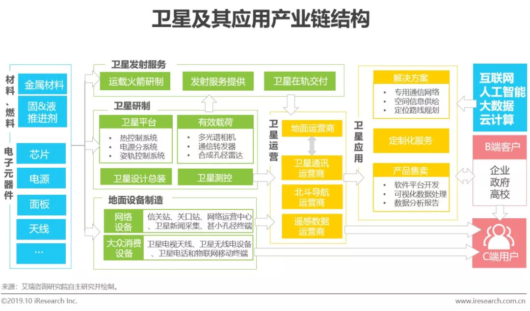 商业航天产业链较为复杂,总体分为四个环节:1. 电器元件材料厂商;2. 卫星研制商、发射服务提供商以及地面设备制造商;3. 卫星运营商与卫星应用服务提供商;4. 终端用户(政府、企事业单位、个人)。与国外相比,我国卫星产业在卫星研制和发射领域,企业实力突出、竞争力强;而在电子元器件、终端类产品、应用系统和运营服务等领域,目前我国企业规模较小,整体实力偏弱,尤其是芯片、板卡、天线、算法、软件、接收器和终端技术水平与国外顶尖水平差距明显。自2015年起,随着民营资本的进驻,大批民营初创航天企业成立。截至目前全产业链均有民营企业进驻。