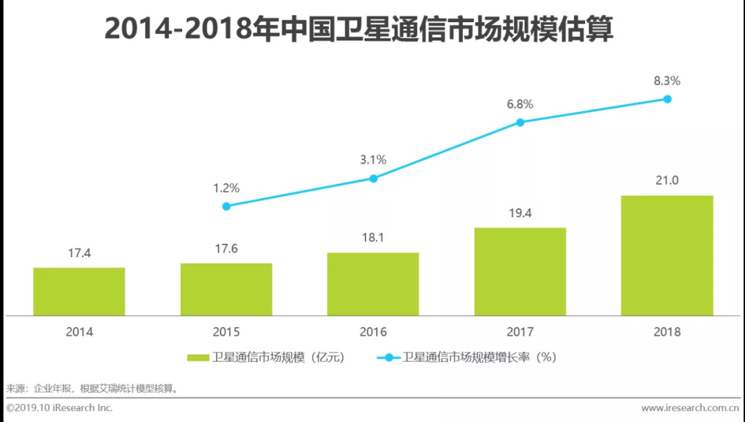 2018年中国卫星通信市场估算已达到21亿元人民币。2016年8月中国首颗移动通信卫星天通一号01星成功发射。2017年3月天通一号卫星移动通信系统投入使用,该年中国卫星通信市场规模相较往年取得了较快的增长。2018年1月,中国首颗高通量卫星投入使用,再次提高了中国卫星通信市场增速。2022年虹云星座、鸿雁星座、银河航天星座完成阶段性部署或完成整个星座建设,届时中国卫星通信市场将会迎来爆发增长。
