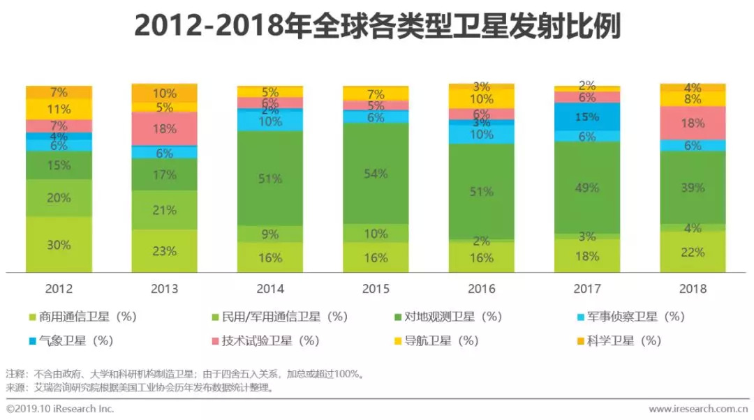2012-2018年间,受益于卫星小型化技术的快速发展以及相应商业模式的不断成熟,全球卫星发射数量总体呈上升趋势。2016年全球卫星发射总数明显下降主要原因是微小卫星发射数量的下降(2016年发射微小卫星数量65颗,相较2015年下降53.6%)。从具体类型来看,各类通信卫星与各类遥感卫星的发射数量占据绝对统治地位。值得注意的是,2013年技术试验卫星发射数量暴增,此后对地观测卫星的发射比例持续提高,这表明遥感卫星小型化技术在该年发展成熟并进行大规模试验。2018年遥感卫星发射比例下降、而技术试验卫星比例再次提高,这意味着未来随着众多公司低轨移动卫星通信技术趋于成熟,通信卫星将取代遥感卫星,成为支撑火箭发射新的增长点。(2019年5月SpaceX星链计划单次发射60颗通信卫星可以支撑这一观点)。