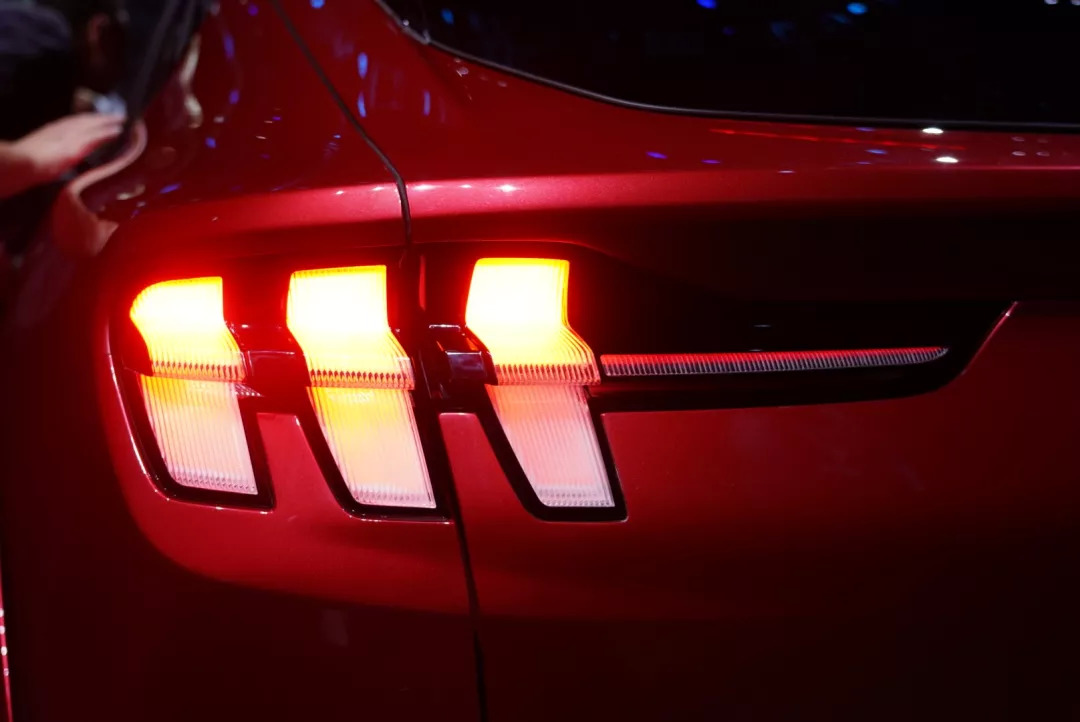 其实从这款车前缀的Mustang就可以看知道,这部电动SUV也是属于整个Mustang车系的一员,所以外形延续了福特经典肌肉跑车Mustang的设计元素,包括溜背设计,最新的三道杠的前大灯,非常具有肌肉感的后肩线、张力十足的车身侧面,具有Mustang特征的三柱式竖杠尾灯。稍微有点区别的是,设计师给后尾灯做了一个箭羽的样式,增加宽度感。