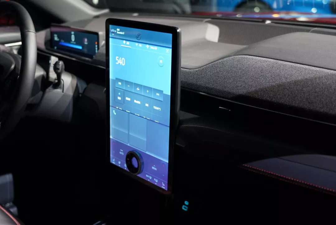 虽然使用了15.5寸的大屏幕,可福特并没有完全放弃实体按钮——屏幕下方保留了一个巨大的旋钮,这可以让驾驶者直接调节音量,这是最省事的直觉操作。为了配合这个巨大的屏幕,福特的一个新团队来负责打造整个人机交互和SYNC新一代系统,更契合于智能手机时代的操作体验,包括个性化的界面布置、自适应学习的功能、语音控制,还有后台A/B模式的OTA升级功能等等——这一切都让Mach-E跟上了电动智能汽车的进步步伐。