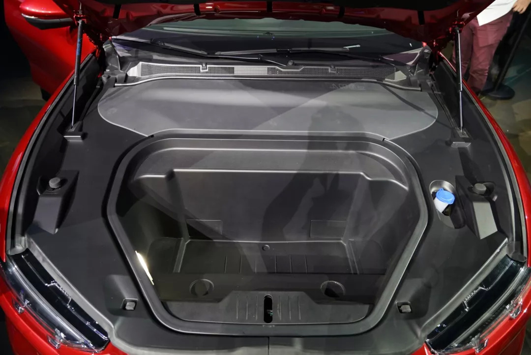 不仅如此,得益于纯电动平台的优势,Mach-E的前舱有一个可以放下20寸登机箱的前置储物空间。这个空间甚至布置了一个出水孔,里面可以直接用水清洗,可以给车主拿来盛放渔具或者运输冰块等等,这非常符合美国用户的使用习惯。后部的行李箱空间也足够的大,两层的隔板设计可以实现后排座椅放倒后的全平空间。
