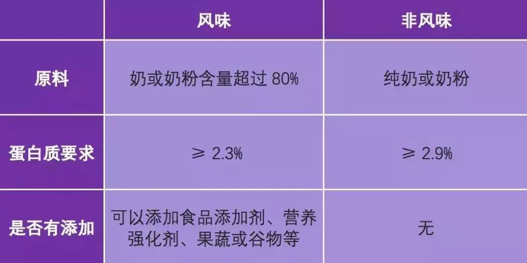 「酸乳」或者「发酵乳」:只能用奶或者奶粉为原料,不能添加其他成分,蛋白质含量需要 ≥ 2.9%;