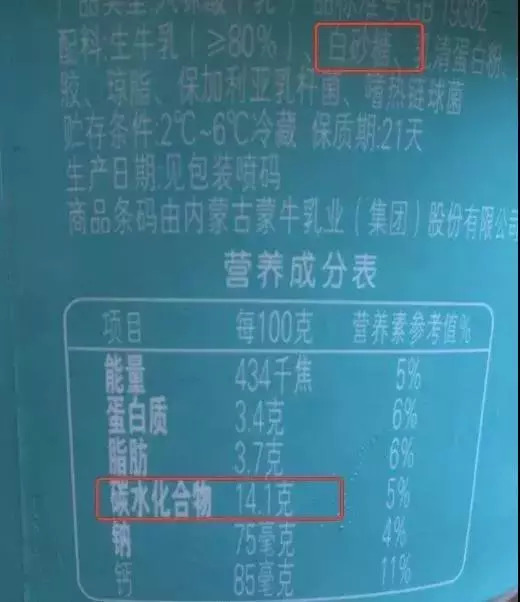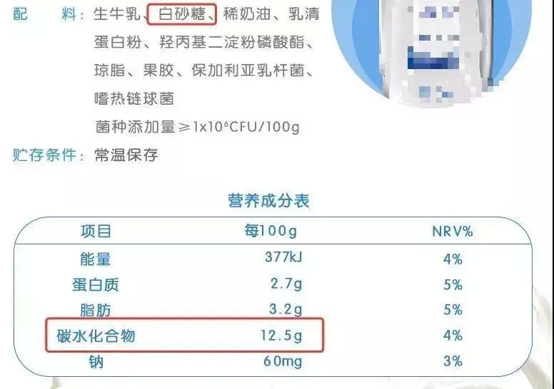 详析:生牛乳 ≥ 80%,菌种符合酸乳要求,添加了白砂糖、乳清粉和增稠剂(明胶、琼脂),碳水化合物高达 14.1%!