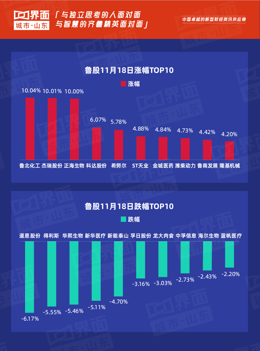 受大盘影响,11月18日,山东省内沪深股票有139只个股上涨,59只下跌,10只与上一个交易日收盘价持平。鲁北化工(600727)、杰瑞股份(002353)、正海生物(300653)三支个股涨停。其中鲁北化工(600727)涨幅10.04%,收于每股7.45元,涨幅居沪深主板第5位;杰瑞股份(002353)涨幅10.01%,收于每股31.86元,涨幅居沪深中小板第5位。