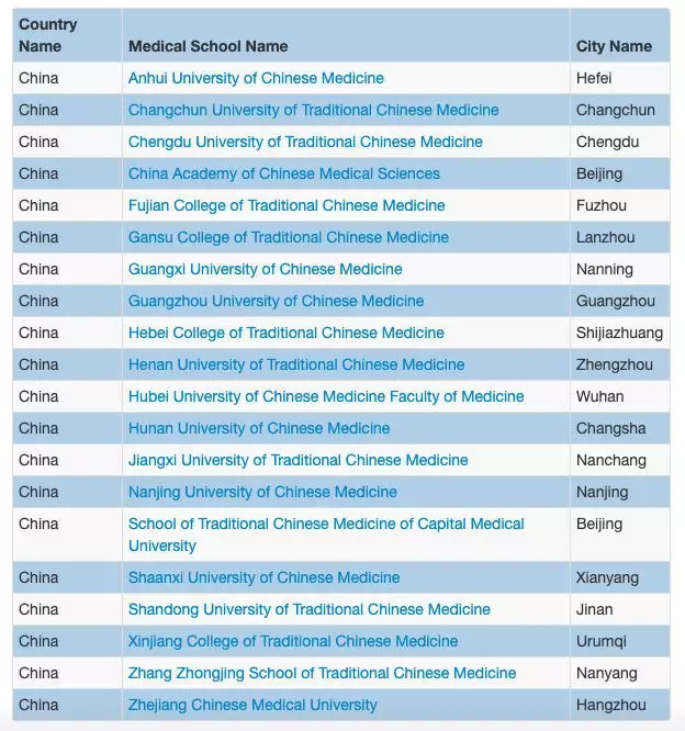 北京中医药大学、上海中医药大学、天津中医药大学、黑龙江中医药大学、辽宁中医药大学、贵阳中医学院、山西中医学院、云南中医药大学8所大学,被世界医学院校名录除名。