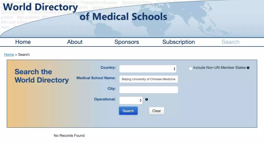 对此,赛柏蓝在世界医学院官网查询,发现已经查询不到北京中医药大学(Beijing University of Chinese Medicine)的相关记录了。