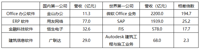 界面新闻选取软件细分领域,中国排名第一和世界排名第一的公司进行对比。在Office软件领域,金山办公和微软Office业务营收相差194倍,在ERP软件领域,用友网络(600588.SH)和SAP(SAP.N)的营收相差25倍,在金融科技软件领域,恒生电子(600570.SH)和FIS(FIS.N)的营收相差17.7倍,在建筑信息软件领域,广联达(002410.SZ)与Autodesk(ADSK.O)的建筑工程与施工业务相差2.3倍。