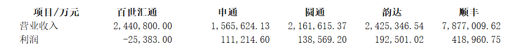 在A股的上市公司中,顺丰控股(002352.SZ)、圆通速递(600233.SH)、申通快递(002468.SZ)、韵达控股(002120.SZ)在内的几家头部快递企业均未亏损。同样在美股上市的中通快递(ZTO.N)上半年净利润也达到20.4亿元。这样比较下来,百世集团是唯一一家亏损的头部快递公司。