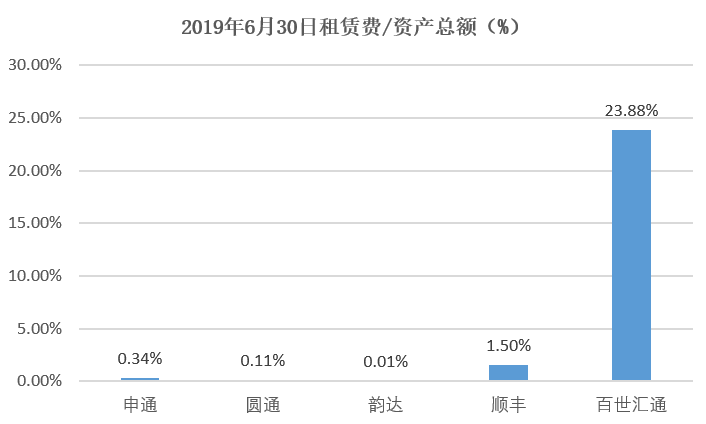 租赁费数据显示,截至2019年6月30日,百世集团通过经营租赁使用权的非流动资产占资产总额的23.88%;相比之下,申通、圆通、韵达、顺丰几家快递巨头披露的长期待摊费用中的场地租赁费占资产总额最高不过1.5%。从亏损的结果来看,租赁模式未必会贡献利润。