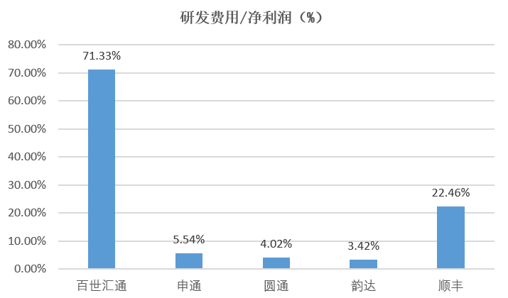 百世集团重点投资在自动化领域这一点,从历年的研发费用中亦可以看出。以最新数据为例,百世集团2019年前三季度的研发费用占据了净利润的70%,而排名第二的顺丰,研发费用仅占净利润的22%。高额的研发费用也是公司亏损的原因之一。据Wind数据统计,除去中通未披露其研发费用,百世集团是加盟制中对技术研发投入最多的公司。