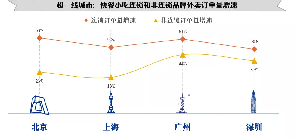 在美团外卖《快餐小吃2019外卖消费洞察报告》数据中,北上广超一线城市连锁订单量增速较高。