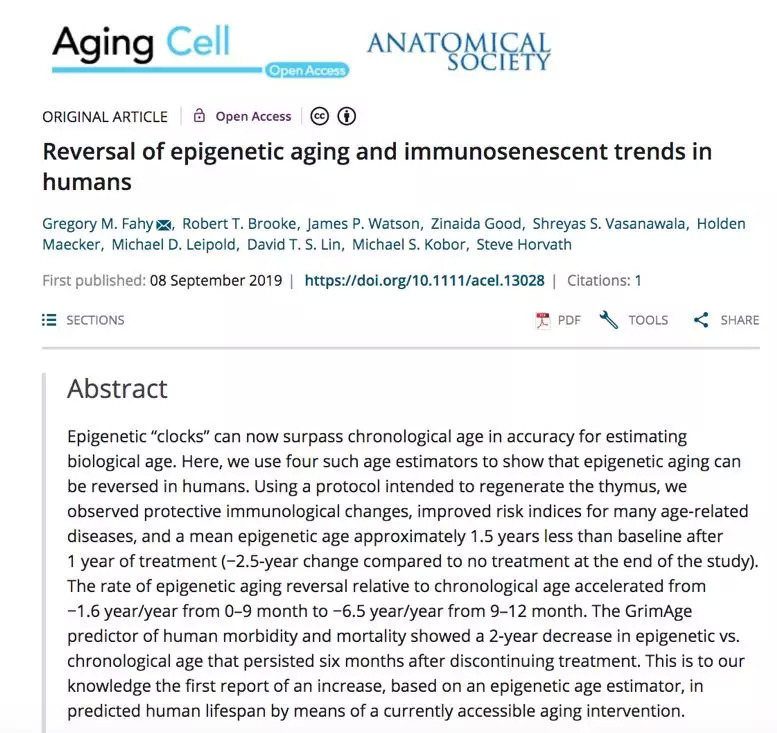 Gregory的报告显示,他们通过某种方法再生了胸腺(一种免疫器官,随着年龄增长会萎缩),对10位患者进行了一年的治疗后发现,样本人群的老年疾病的风险指数有所降低,同时在生物学年龄上比治疗前年轻了2.5岁。此外,在停止治疗处理后,这种效果甚至可以持续达到6个月之久!