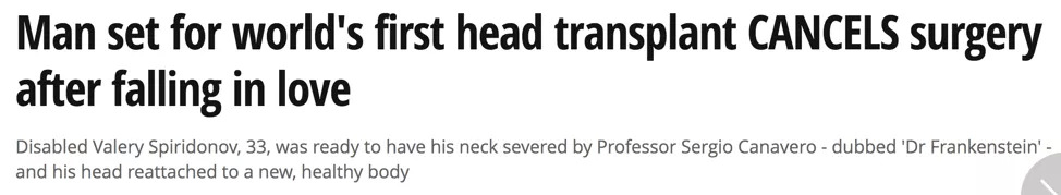 2017年11月,意大利神经外科专家塞尔吉奥·卡纳韦罗( Sergio Canavero)就宣布,他和自己的合作伙伴,哈尔滨医科大学教授任晓平成功地把头颅从一具尸体移植到另外一具尸体上。