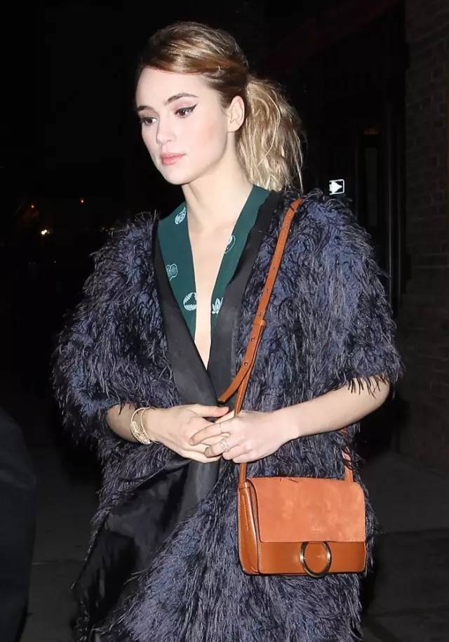 Faye包有两个尺寸,这里我们说的是小号Faye.最受欢迎的是麂皮与小牛皮的拼接款。金属圆环的古着设计,洋溢着6、70年代的文艺情愫。难怪女神高圆圆对此爱不释手,到哪儿都背着。