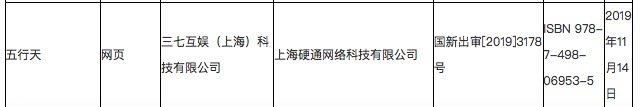 根据国家新闻出版广电总局官网信息,由三七互娱出版的游戏“五行天”在11月14日获批。