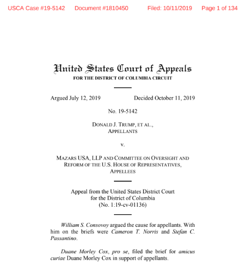 对于特朗普是否应该上交财务记录一案,特区上诉法院法官塔特尔 (David Tatel) 认为,众院进行的是“立法部门的合法调查”。根据众院规章和美国宪法的规定,监督和改革委员会有权发出传票,而Mazars公司必须遵守。