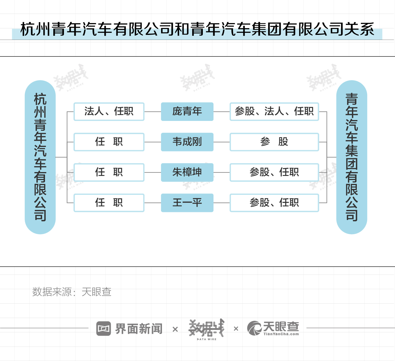 天眼查数据显示,包括庞青年、韦成刚等4名在青年汽车集团的任职及参股人员,均在杭州青年汽车有限公司中任职。