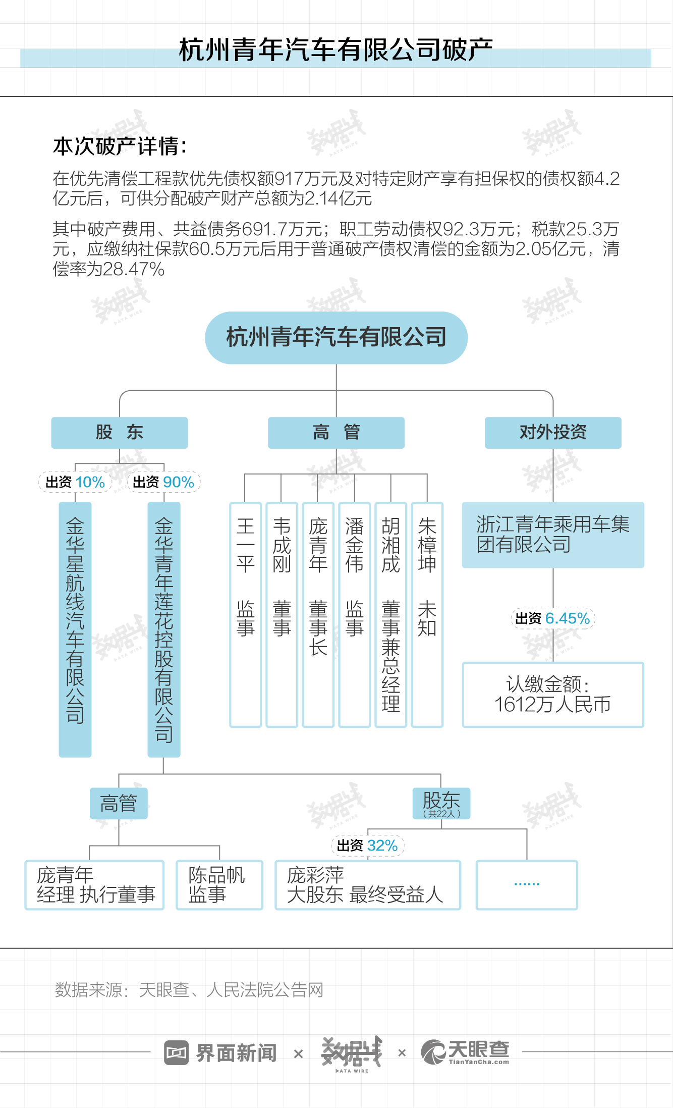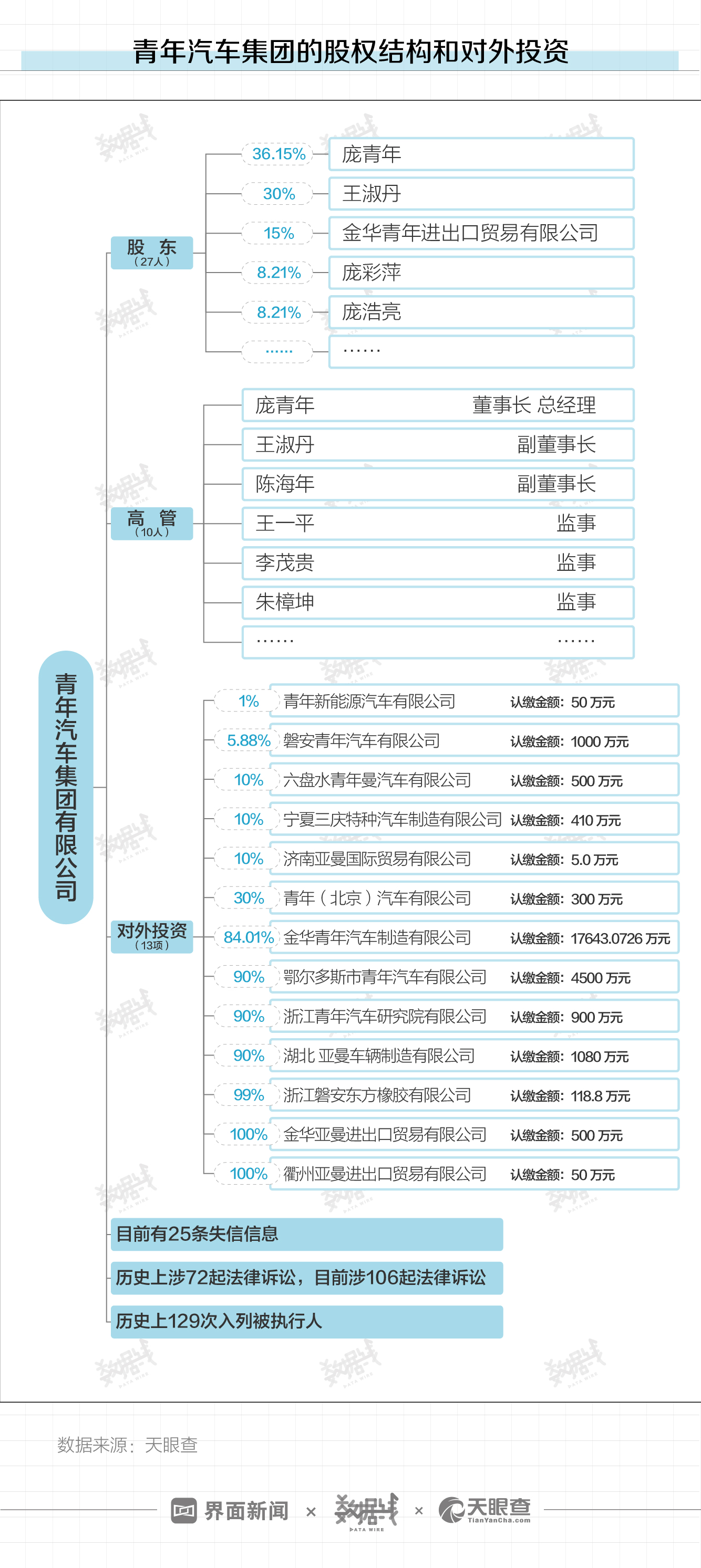 杭州青年汽车有限公司成立于2008年,法定代表人及董事长为青年汽车集团董事长庞青年,大股东为金华青年莲花控股有限公司。金华青年莲花的大股东则是庞青年女儿庞彩萍。