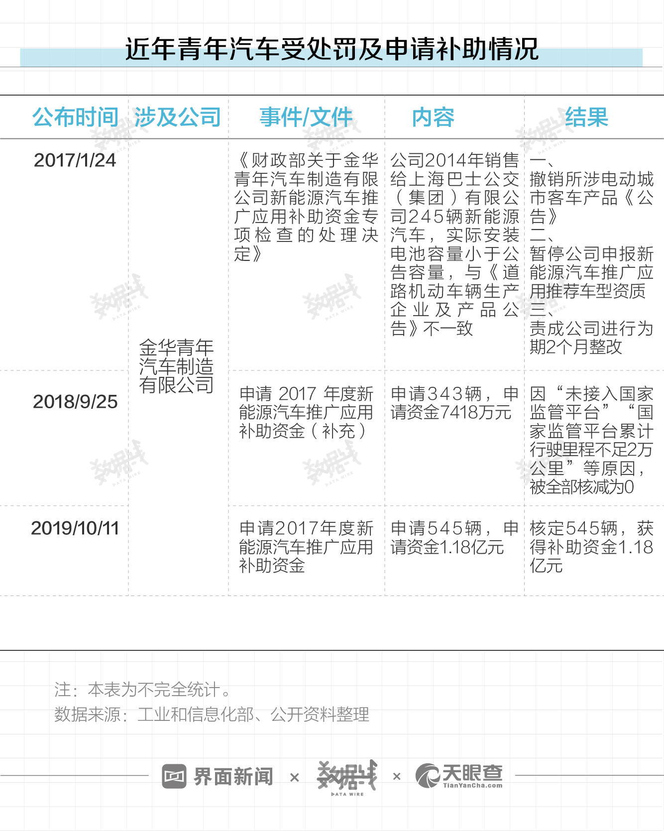 在此之前,青年汽车也曾申请过工信部2017年度新能源汽车推广应用补助资金。但因“未接入国家监管平台”“国家监管平台累计行驶里程不足2万公里”等原因,青年汽车共计343辆车、7418万元的申请被全部削减。2017年,青年汽车更是因为交付的汽车电池容量小于公告容量,而受到工信部处罚。