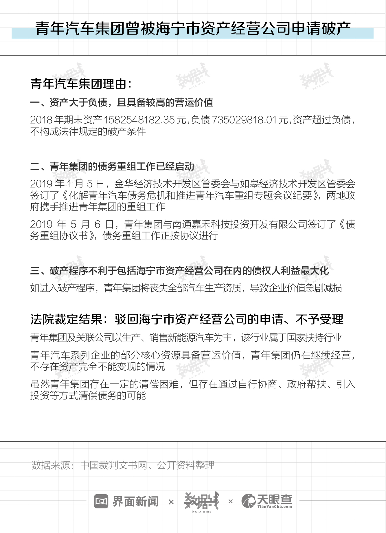 公开资料显示,今年8月青年汽车集团被海宁市资产经营公司申请破产清算,青年汽车提出异议,称已和金华经济技术开发区管委会、如皋经济技术开发区管委会及如皋市人民政府全资控股的南通嘉禾科技投资开发有限公司积极合作,启动公司债务重组。金华市中院最终驳回了此次破产申请。