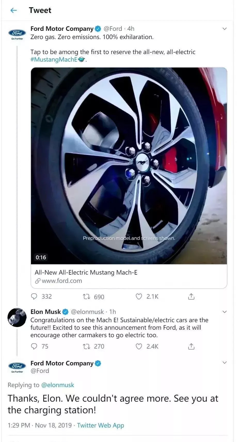 投桃报李。对马斯克的祝贺,福特公司在推特上回应,“谢谢你,埃隆。我们完全同意。充电站见!”