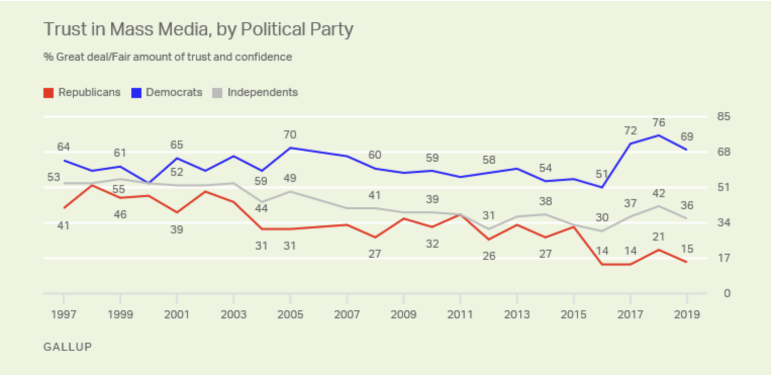 总统特朗普对这一分歧无疑贡献了不少力量。在2016年特朗普竞选总统、遭到媒体大面积负面报道时,共和党对媒体的信任度也随之下降。2015-2016年间,共和党人对大众媒体的信任下跌了18个百分点,至历史最低水平的14%,直到2018年才出现微幅反弹。