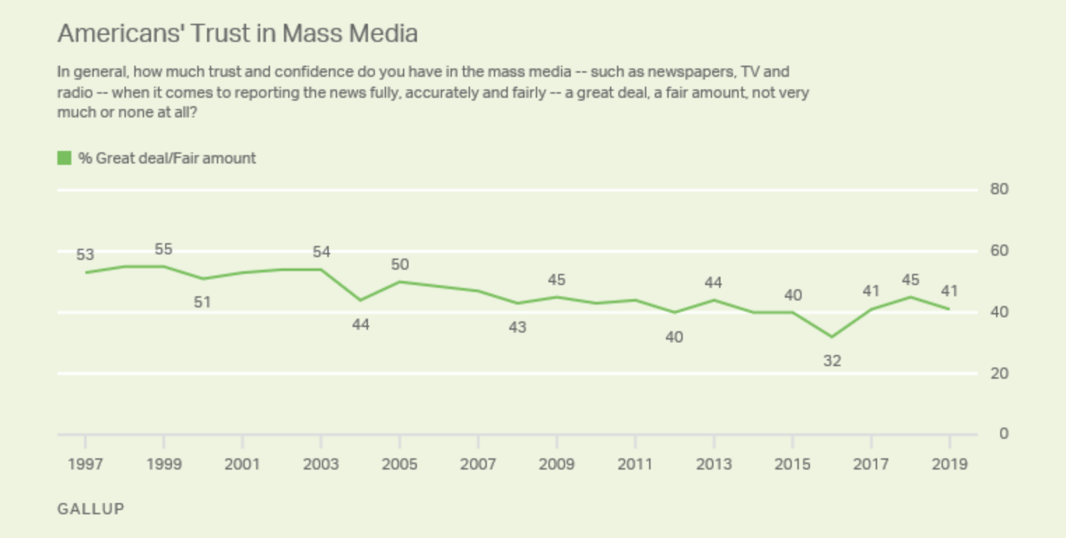 民调机构盖洛普近日发布的年度调查报告显示,超过一半的受访者趋向于不信任身边的传播机构;仅41%相信大众媒体,他们认为报纸、电视和电台中播放的新闻“全面、准确、公正”。具体而言13%的人表示非常相信,28%的人称比较相信,另有30%的人表示不是很相信,28%的人称完全不相信。