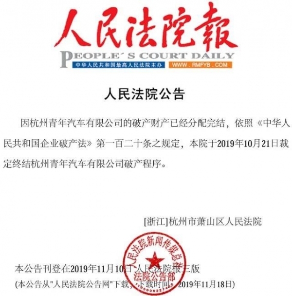 近日,据人民法院网公告显示,因杭州青年汽车有限公司的破产财产已经分配完结,依照《中华人民共和国企业破产法》第一百二十条之规定,杭州市萧山区人民法院已于2019年10月21日裁定终结青年汽车破产程序。