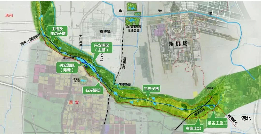 根据北京市水利规划设计研究院编制的《永定河全流域生态修复与水资源保护规划》,永定河流域将建多处大型湿地,涵养水源,增强河水自净能力。其中,永定河下游的湿地将建在大兴国际机场附近的大兴、固安、天堂河一线,规模与白洋淀相仿。
