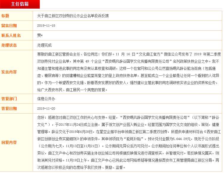 11月18日,有网友在该官网“主任信箱”栏目对“喝风辟谷”公司被列入双创补贴名单一事提出质疑:“这样一个在官网和公众号公然宣扬喝风辟谷能治百病(包括癌症、糖尿病等)的封建糟粕企业能堂而皇之的登上政府扶持名单,甚至能成立一个企业都是让任何一个看到的人诧异的。作为一个希望西安文化强、盼着西安发展好的西安人,强烈建议主管此事的同志调研核实该企业的资质和业务,给广大西安市民、曲江居民一个满意的答复。”