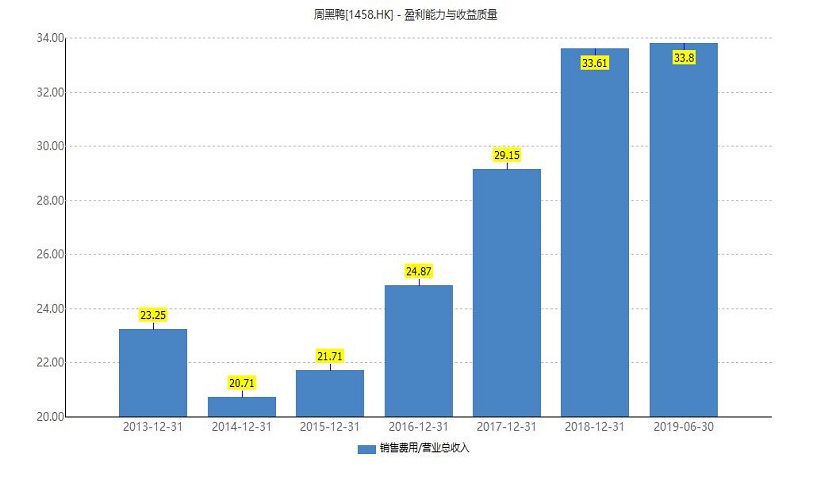 我们发现,周黑鸭近年来在销售费用上的投入也是大幅攀升。从2016年起,周黑鸭销售费用占营业收入的比值从24.9%增加到了今年上半年的33.8%。涨幅达到9个百分点。而同期,净利率的降幅为11.7个百分点。可见,销售费用增长是周黑鸭净利率下滑的主要原因。而销售费用猛增背后,也凸显了周黑鸭产品吸引力下降的事实。