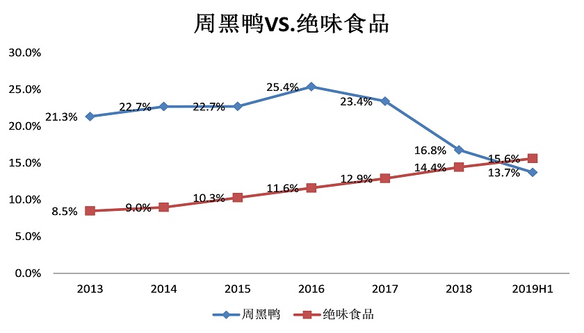 定价相对较高,本来就导致了周黑鸭潜在客户群体不如绝味食品、煌上煌广泛。在已经失去了营业收入规模优势的基础上,如果再失去了净利率更高的优势,那么周黑鸭高端定位就显得尤为尴尬了。