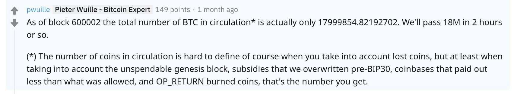 总的来说,我们可以计算比特币在600,000 个区块时的实际供应量,方法是从预期的1800万 BTC中减去可证明丢失的币。