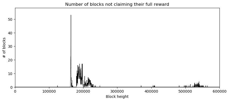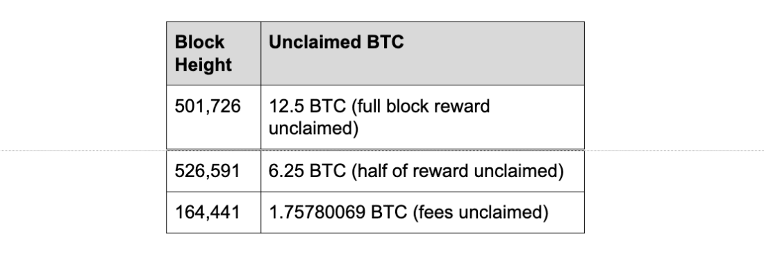 在区块高度162,000附近,我们可以看到出现了很多未申请全额奖励的事件,另一个阶段是发生在180,000 到230,000个区块之间,最后一个阶段则发生在第530,000个区块附近。