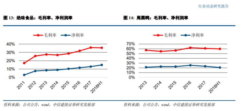 中信建投证券研报显示,绝味食品销售费用率始终维持在8%左右的水平,而对比周黑鸭,由于2017年开店量增32%,且全部为直营门店,销售费用大幅上涨,销售费用率提升至29.15%,明显高于绝味食品2017年11.07%的销售费用率。