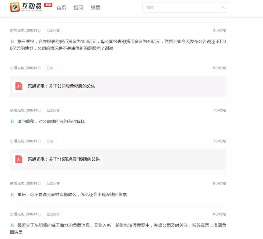 在深交所互动易上,有股民要求东旭光电董秘对债务违约做出解释。但截至目前,该公司未给出任何回应。