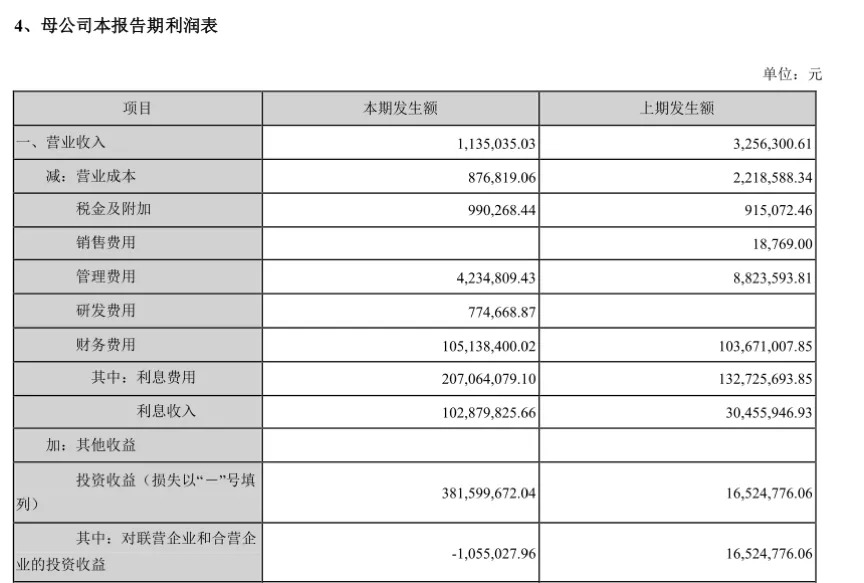 值得一提的是,在财务费用一栏中(母公司利润表),东旭光电母公司第三季度利息收入1.02亿元,投资收益3.81亿元,净利润达到2.29亿元。