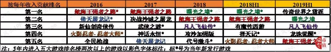 风云君统计了公司2016年至今的每年前五大游戏排名。