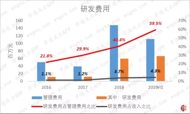 研发费用占管理费用的比重近年来不断上升。2019年上半年,公司当期1.11亿元的管理费用中,有6,630万元为研发费用,占比将近六成。