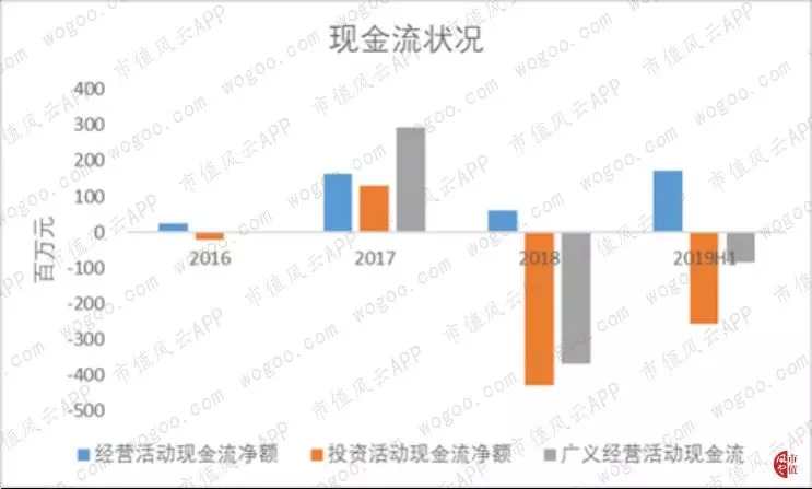 近期公司通过投资活动大幅流出现金,导致其广义经营活动现金流净额(即“经营活动现金流净额”加上“投资活动现金流净额”)在2018年和2019年上半年分别为-3.69亿元和-8,425万元。