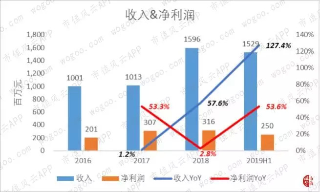 公司最新的业绩表现优于过往披露的任一时期。2019年上半年,公司收入15.3亿元,同比增长127.4%;净利润2.5亿元,同比增长53.6%。