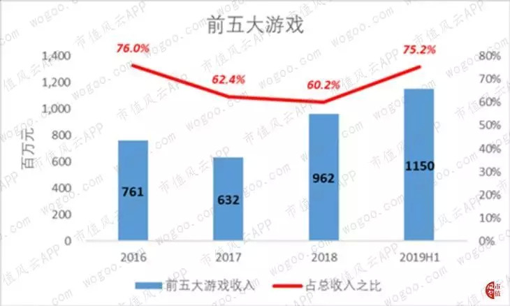 2019年上半年,前五大游戏收入占总收入的比重进一步上升至75.2%。