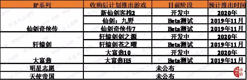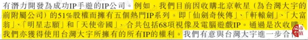 公司在2018年通过收购台湾大宇的前子公司北京软星,获得了5个台湾大宇的热门IP系列:《仙剑奇侠传》、《轩辕剑》、《大富翁》、《明星志愿》和《天使帝国》。