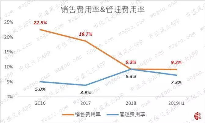 公司的销售费用率近年来一路走低,2019年上半年为9.2%。