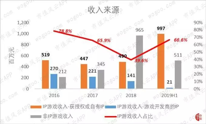 2019年上半年,公司来自获授权或自有IP的游戏收入为9.97亿元,来自游戏开发商IP的游戏收入为2,100万元,两项IP游戏收入合计占总收入的66.6%。