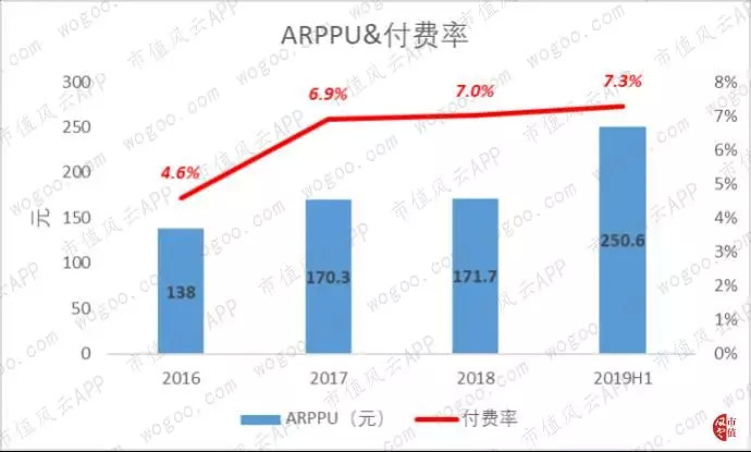 2019年上半年,公司的平均每付费用户收入为250.6元,用户付费率为7.3%,均创历史新高。