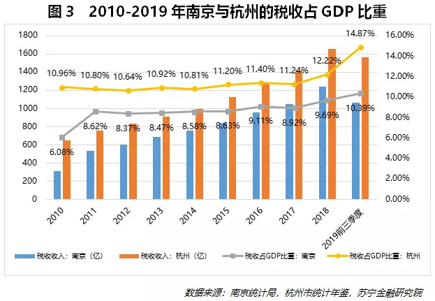 宏观的经济情况能反映地区的外部环境,而税收则是反应区域内的税负情况。税收收入的绝对值会受地区大小、企业、人口数量等因素的影响,因此用生产总值税负率(税收收入/GDP)来衡量两市的税负情况(见图3)。可以看到, 南京的整体税负率长期低于杭州,这就有利于吸引更多的企业,形成产业聚集,带动金融发展。